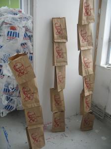 In my studio, may 2009: original recreations of KFC fast food packaging made by screenprinting onto mass bought Kraft SOS fast food packaging bag ( seriously, thats their name!)