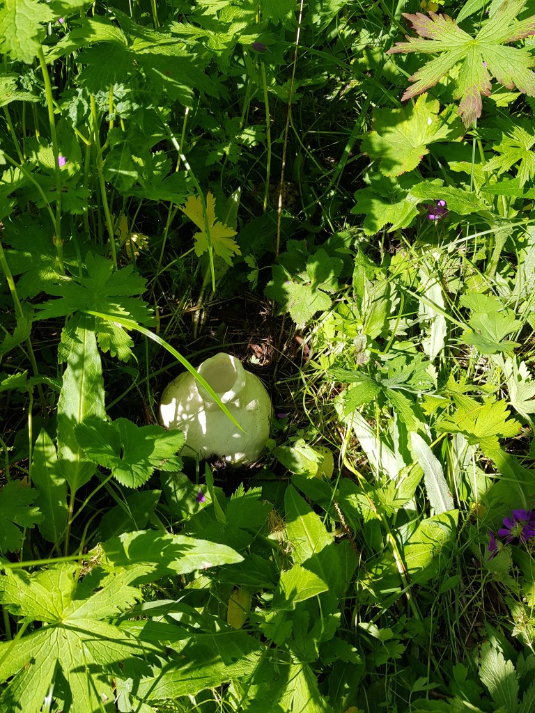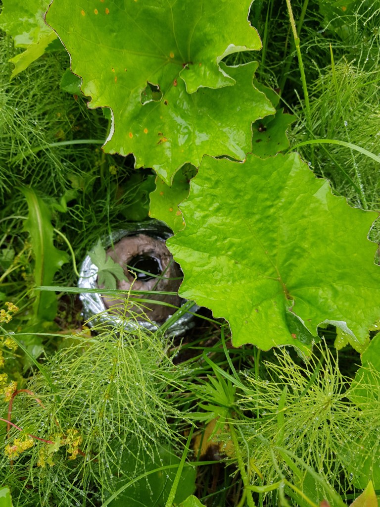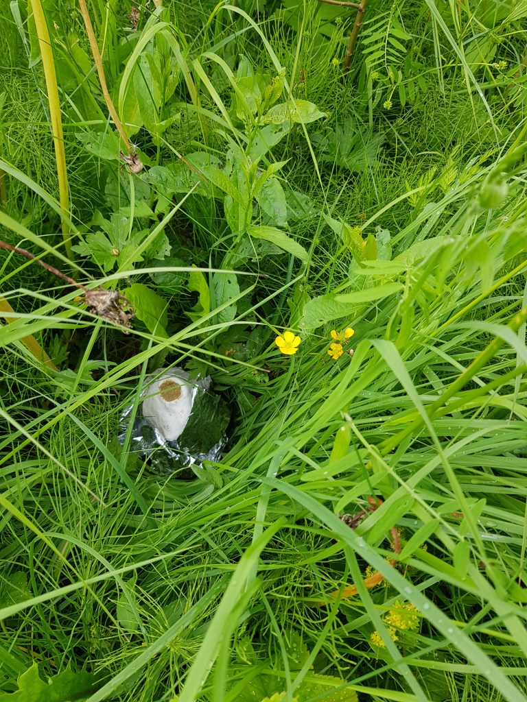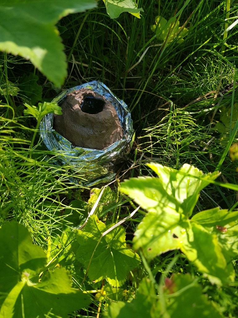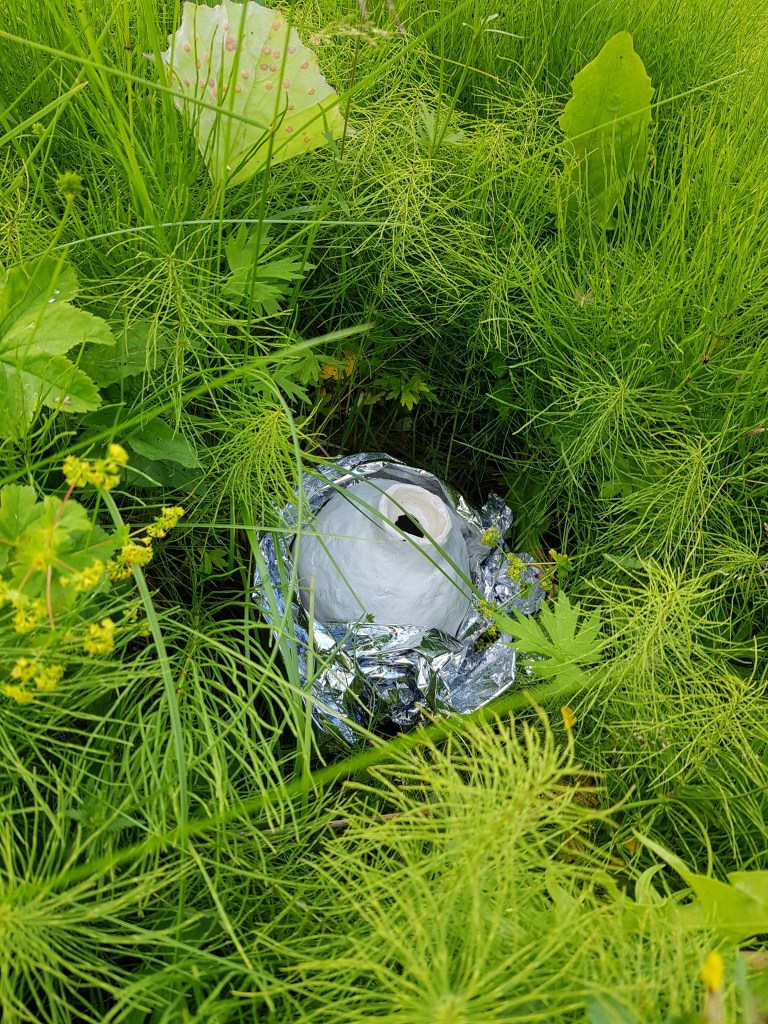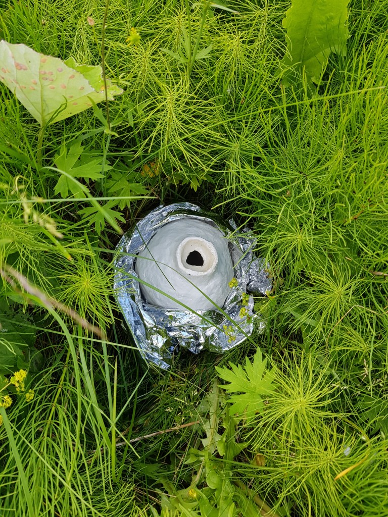 This work has been influenced by looking into a theorised point of time called the “population bottleneck” where the number of humans on earth could have reached as low as 3,000. During this period, human creativity also seemed to expand ( called “behavioral modernity”) with an interesting array of artifacts having been discovered showing this development under these intense conditions at the time. These finds include decorated ostrich egg shells, which were used to store water, under rocks or hidden in sand in parts of Africa during periods of intense heat that nomadic humans would return to, a practice that occurs to this day. Various clay containers have been placed around Folkeparken (the site of the exhibition “Carrier”), wrapped in survival blankets, filled them with modern high end consumer products, or left empty to return to the earth, kept in an intriguing state between practical storage object or collecting vessel (collecting rainwater), religious or spiritually derived totem or sci-fi film props of aliens eggs.