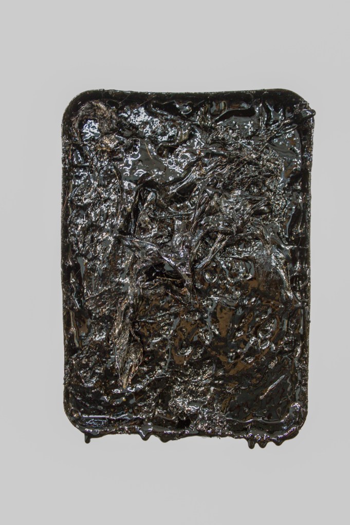 The artist ‘inserts’ himself into autonomously unfolding processes based on the breakdown of these items, and guides the subsequent reformations as they happen. The artist attempts to produce works which rely on the results of chemical reactions or algorithmic coding; a tactic of distancing the artist’s hand from every decision in the making process, but meaning the artist still retains the role of guiding these unfolding processes to an aesthetically coherent end.